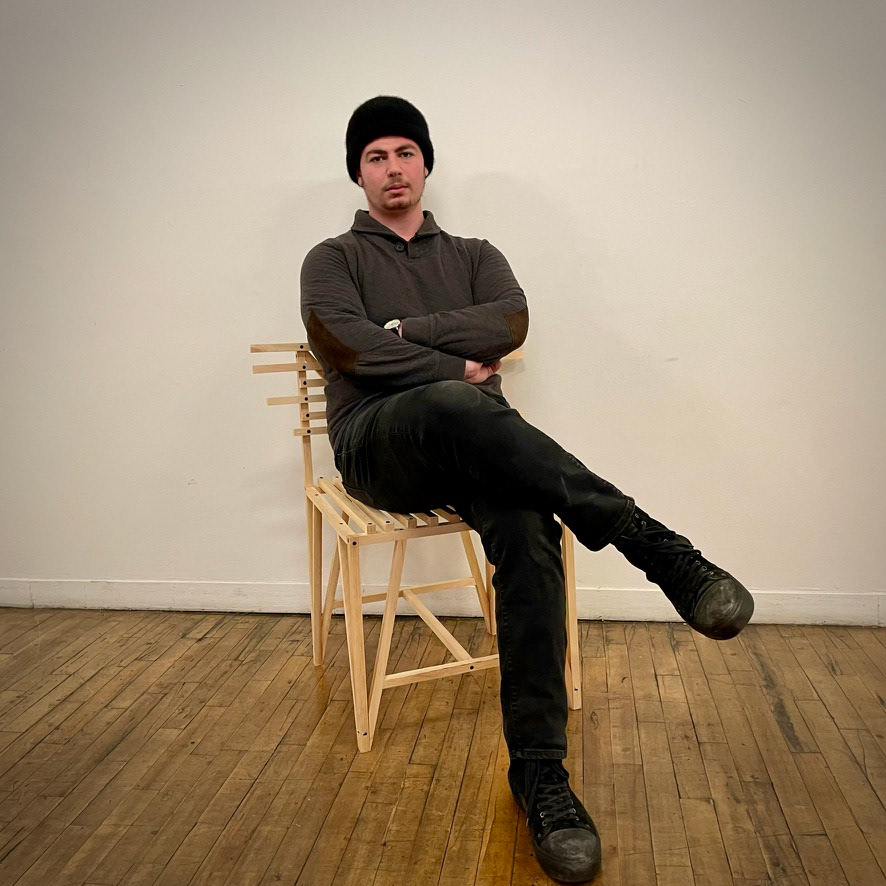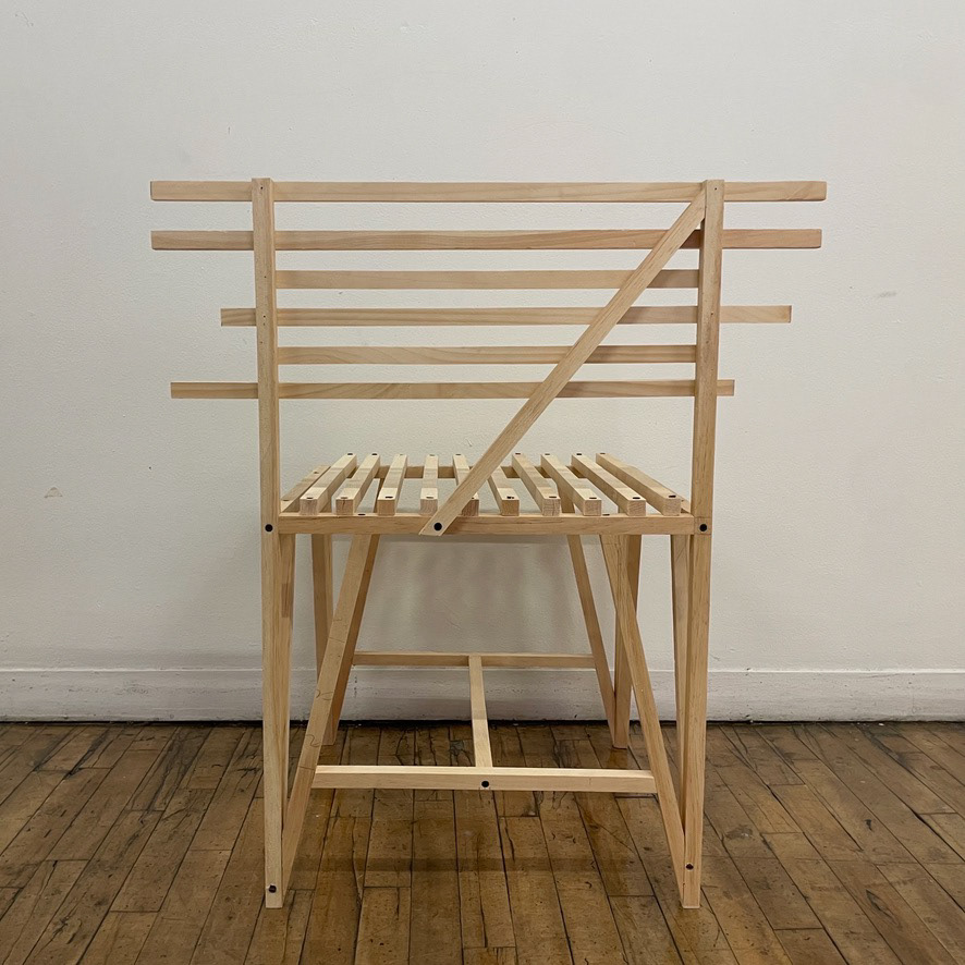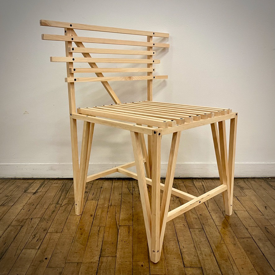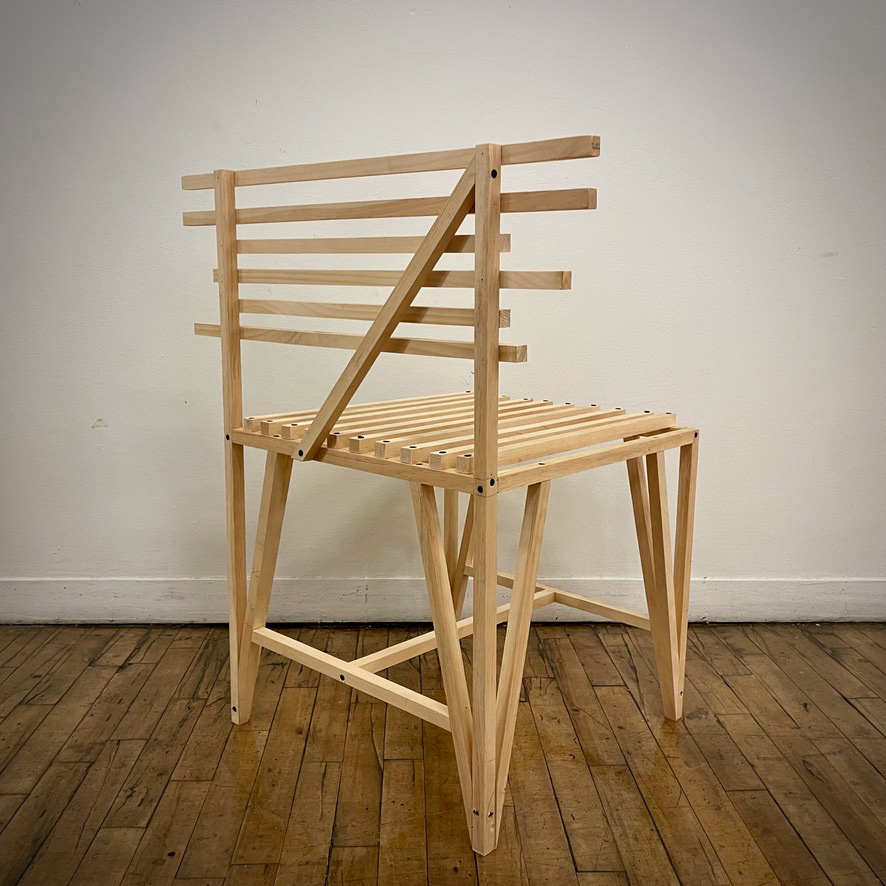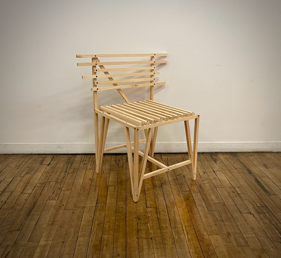 a contemporary, minimalist styled chair constructed of 3/4" x 3/4" strips of poplar wood & screws seat dimensions: 19.5” x 19.5” x 18” chair dimensions: 28” x 19.5” x 32”