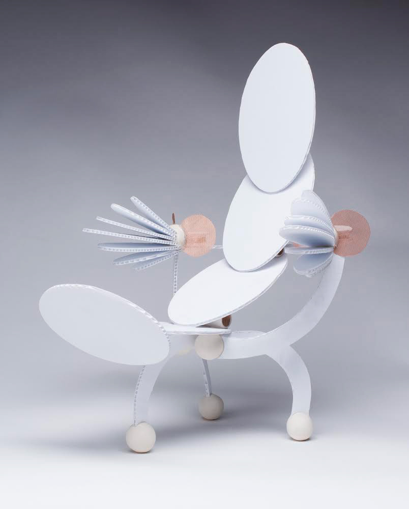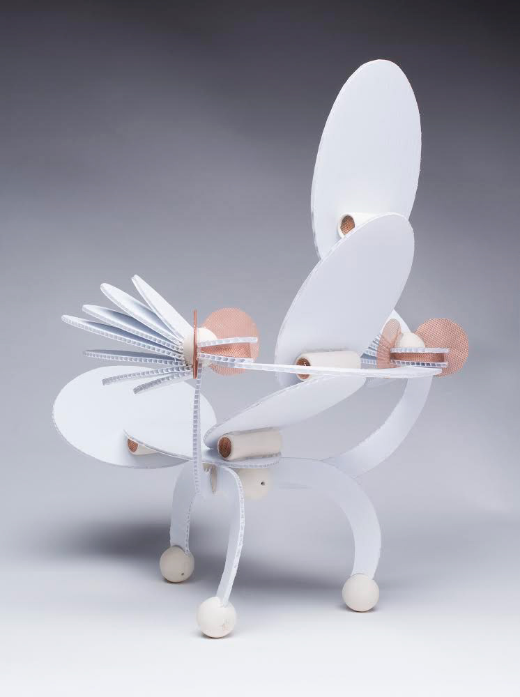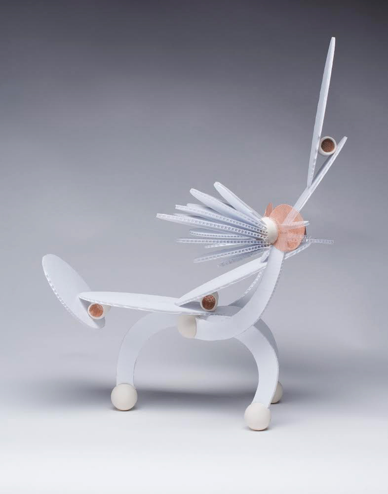 concept chair design constructed of plastic corrugated board, porcelain, copper mesh, adhesive