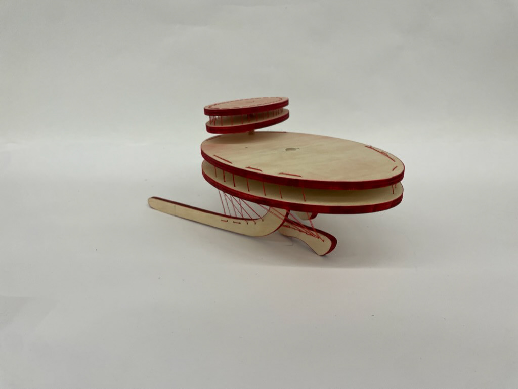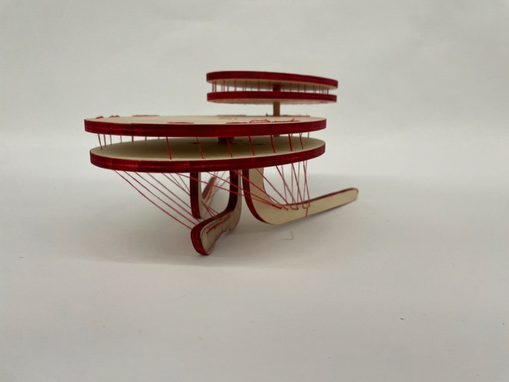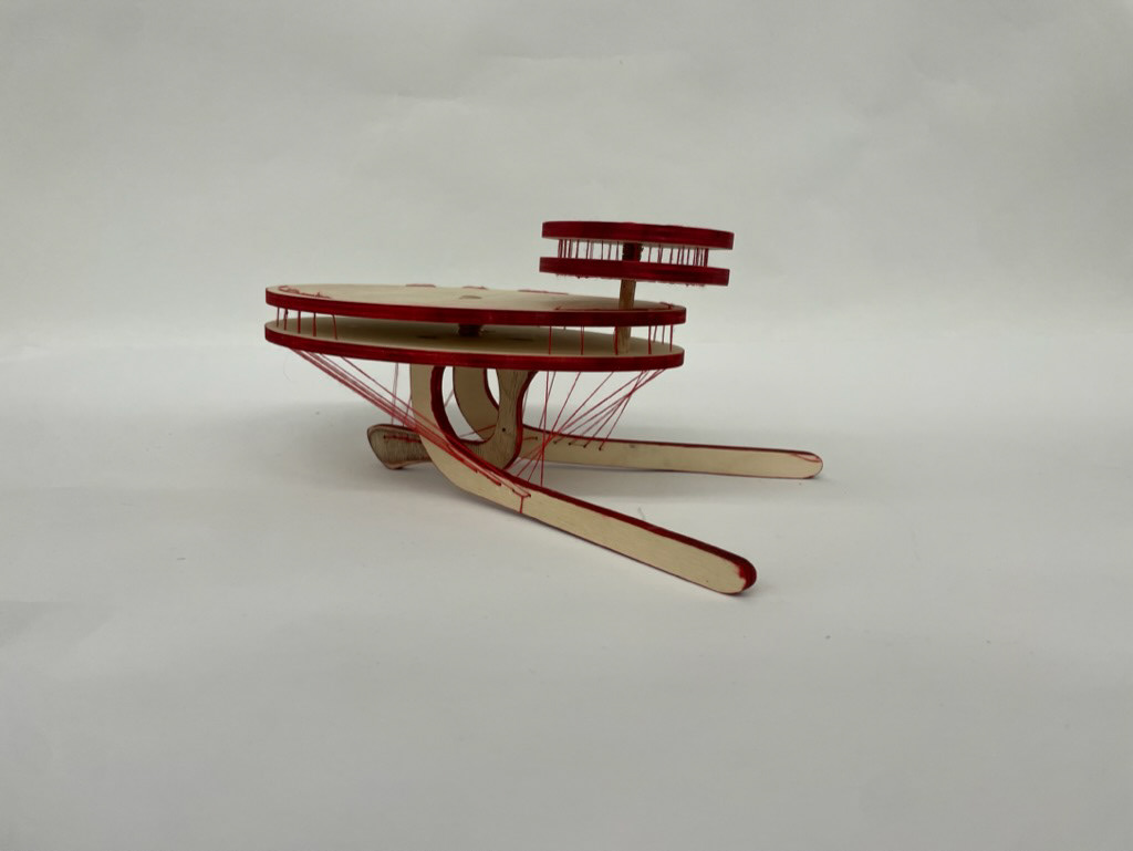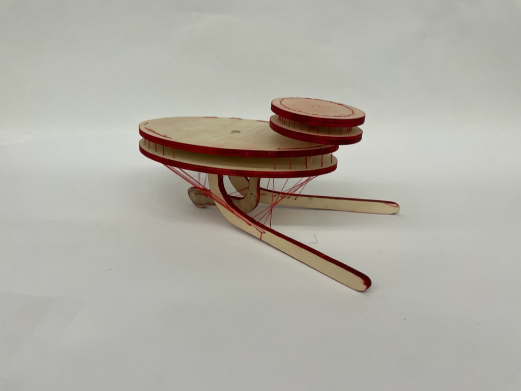 table top object constructed of red thread, birch ply, copper wire, wooden dowel, & ink dimensions: 11.5” x 7.5” x 4.5”